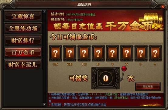 活动详情:活动期间充值领取每日充值5档奖励,分别可获得4、1、1、1、1次摇杆次数,摇杆的次数会从低到高显示,每日充值的档次后面一档都会高出前面10倍金币收益,如果一天5档的领完就可获得当天金币的最大收益,获得的金币将在每日0点通过邮件的方式发送给玩家。
