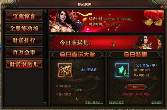 活动详情:活动期间玩家可在今日特惠里以优惠的价格购买相应的道具,每购买一次便可获得一个随机幸运数字;购买越多,中奖几率越大;每日21:00开奖,中奖数字所属玩家将会获得当日幸运大奖,奖励通过邮件发放。