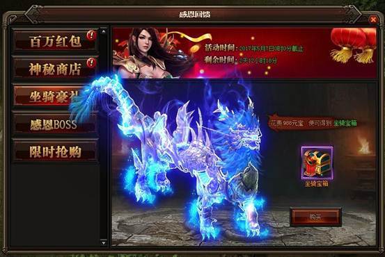活动详情:活动期间,花费988元宝便可获得坐骑宝箱,坐骑宝箱有几率开出永久终极坐骑原始神龙,不要错过哦~