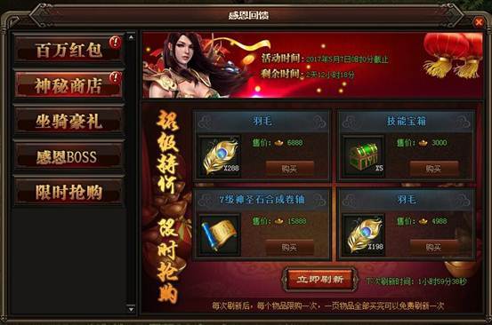 活动详情:玩家最期待的神秘商店又来了哦,小伙伴们可以使用金币、礼金、元宝在神秘商店内购买所需道具,只要399元宝就可以进行刷新,每样道具只能购买一次,如果这一页的道具购买完了可以免费刷新一次。