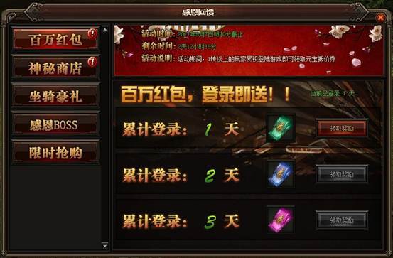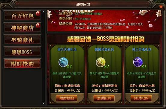 活动详情:活动期间玩家可以以超低的折扣价格购买BOSS灵魂礼包,礼包每人每天限购10次,小伙伴们不要错过哦