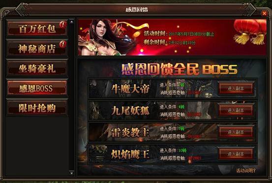 活动详情:活动期间玩家可在挂机地图里打小怪来获得感恩卷轴,例如祖玛寺庙、赤月峡谷、牛魔寺庙、魔龙城、狐月山谷、冰晶神殿、雷炎魔窟、苍月岛等都可以获得感恩卷轴,玩家获得感恩卷轴后可消耗相应卷轴进入副本,副本要求等级为1转、4转、7转、10转、对应消耗的卷轴为100卷轴、100卷轴、100卷轴、200卷轴。BOSS会随机爆出2468转装备不等。