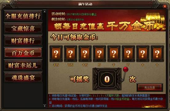 活动详情:活动期间充值领取每日充值5档奖励,分别可获得4、1、1、1、1次摇杆次数,摇杆的次数会从低到高显示,每日充值的档次后面一档都会高出前面10倍金币收益,如果一天5档的领完就可获得当天金币的最大收益,获得的金币将在每日0点通过邮件的方式发送给玩家。