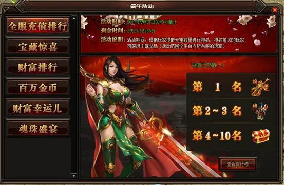 活动详情:活动期间系统会根据玩家提取的元宝数量来进行排名,此活动是按照全服的充值榜来算的,排名前10名会获得极品绝·飞升武器、绝·飞升衣服、绝·飞升防具箱。奖品会在活动结束后次日通过邮件发放给玩家。
