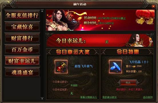 活动详情:活动期间玩家可在今日特惠里以优惠的价格购买相应的道具,每购买一次便可获得一个随机幸运数字;购买越多,中奖几率越大;每日21:00开奖,中奖数字所属玩家将会获得当日幸运大奖,奖励通过邮件发放。