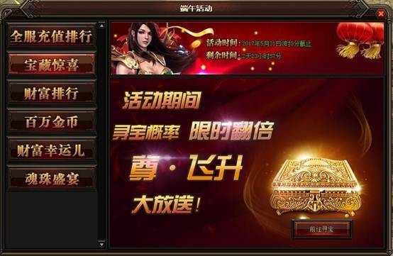 活动详情:活动期间寻宝概率限时翻倍,更有几率直接开出尊·飞升装备哦~