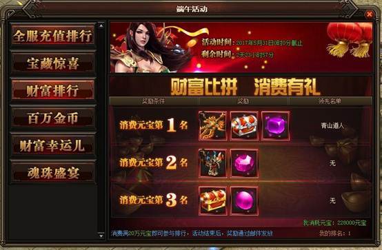 活动详情:活动期间,消费满20万元宝即可参与排行,活动结束后奖励会通过邮件的方式发放给玩家~