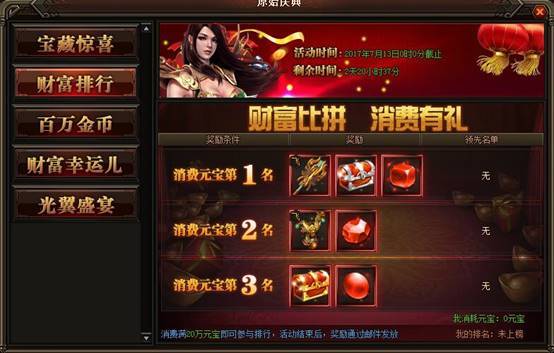 活动详情:活动期间,消费满20万元宝即可参与排行,活动结束后奖励会通过邮件的方式发放给玩家~