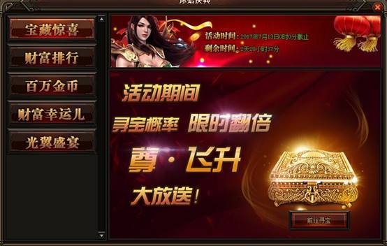 活动详情:活动期间寻宝概率限时翻倍,更有几率直接开出尊·飞升装备哦~