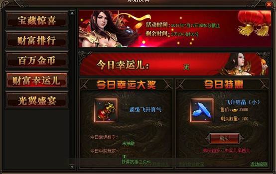 活动详情:活动期间玩家可在今日特惠里以优惠的价格购买相应的道具,每购买一次便可获得一个随机幸运数字;购买越多,中奖几率越大;每日21:00开奖,中奖数字所属玩家将会获得当日幸运大奖,奖励通过邮件发放。