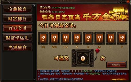 活动详情:活动期间充值领取每日充值5档奖励,分别可获得4、1、1、1、1次摇杆次数,摇杆的次数会从低到高显示,每日充值的档次后面一档都会高出前面10倍金币收益,如果一天5档的领完就可获得当天金币的最大收益,获得的金币将在每日0点通过邮件的方式发送给玩家。