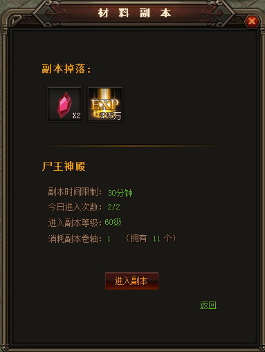 材料副本包括尸王神殿、牛魔神殿、赤月峡谷、魔龙城、狐月山谷与冰晶神殿,每个副本当前可进入2次。由于难度系数的不同,对应的玩家进入等级也不同。