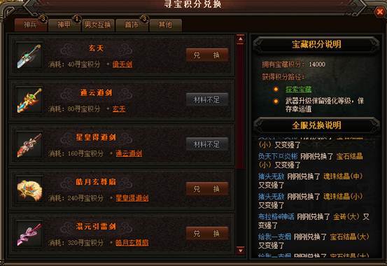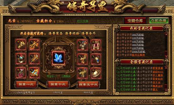 通过寻宝可获得极品的装备、经验、以及BOSS召唤令牌等道具